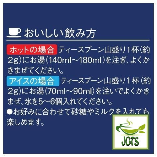 Iced: Put one heaping teaspoon (2 Grams) in hot water (70-90ml). Add 5-6 ice cubes and stir gently until cold.