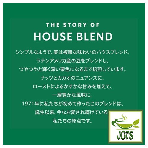 Coffee with a ground aroma and taste that spreads with each cup. A popular flavor representing Starbucks. This "House Blend"coffee is characterized by Nut and Cocoa nuances, a flavor that perfectly harmonizes with the slight sweetness of the roast, as well as the acidity and richness.