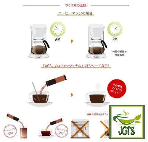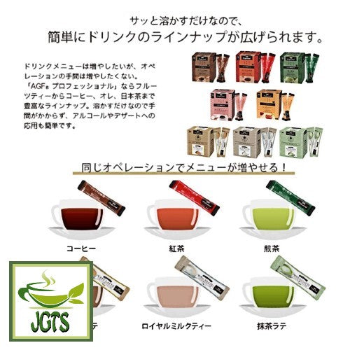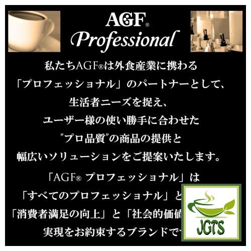 AGF is involved in the restaurant industry and as a "professional" partner, we capture the needs of consumers and tailor them to user convenience. Providing “professional quality” products and a wide range of solutions. “AGF® Professional” is a brand that promises “improvement of consumer satisfaction” and “creation of social value” along with “all professionals”. Enjoy "Cafe Shop" quality at home with AGF's Professional Rich Matcha Latte stick type.