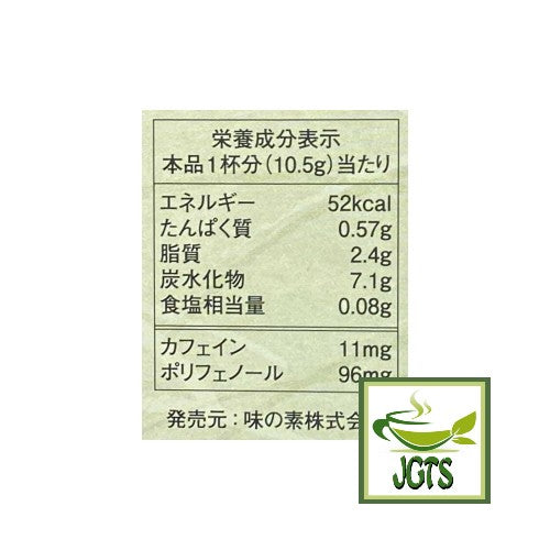 Ingredients:  Creaming powder (contains milk ingredients) (manufactured in Japan), sugar , dextrin, green tea, powdered skim milk, yeast extract / pH adjuster, milk protein, flavoring (derived from milk), stabilizer (processed starch), fine silicon oxide, sweetener (aspartame/L-phenylalanine compound, acesulfame K), Emulsifier, seasoning (amino acid).