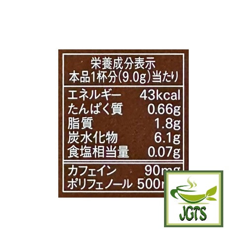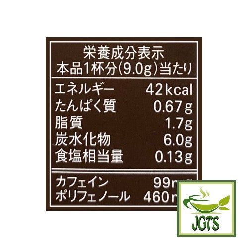 Nutrition: (Serving Size 9.0g), Energy: 43kcal, Protein: 0.66g, Fat: 1.8g, Carbohydrates: 6.1g, Salt equivalent: 0.07g, Polyphenols: 5000mg, Caffeine: 90mg, Potassium: 110mg, Phosphorus: 19mg.