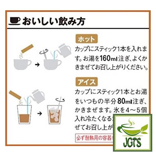 Hot: Pour one stick in a cup of hot water (160 ml), stir well and enjoy.