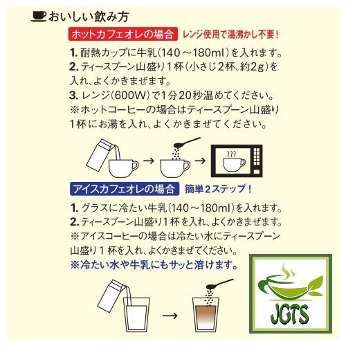 Cafe Au Lait: Put two heaping teaspoons (3 grams) in Milk (140-180ml). Add 5-6 ice cubes and stir gently until cold.