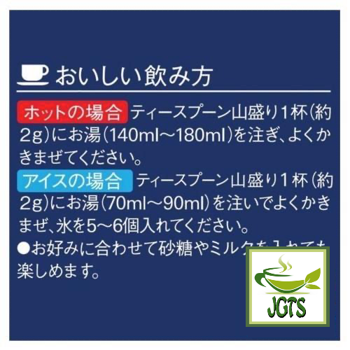 Iced: Put one heaping teaspoon (2 Grams) in hot water (70-90ml). Add 5-6 ice cubes and stir gently until cold.