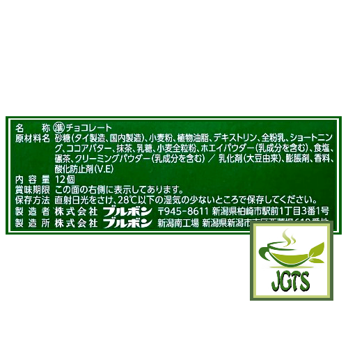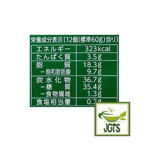 Ingredients: Sugar (made in Thailand and Japan), wheat flour, vegetable oil, dextrin, whole milk powder, shortening, cocoa butter, matcha, lactose, whole wheat flour, whey powder (contains milk ingredients), salt, tencha tea, creaming powder (contains milk ingredients) / emulsifier (derived from soybeans), leavening agent, flavoring, antioxidant (V.E.).