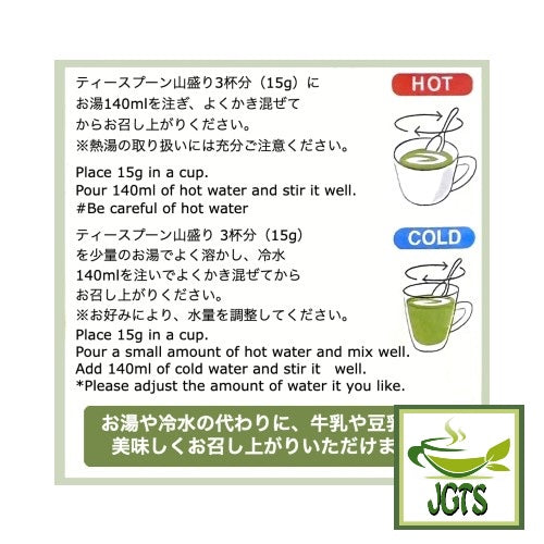 Hot: Put in a cup, (15 grams), pour 140cc hot water (or milk), stir well.