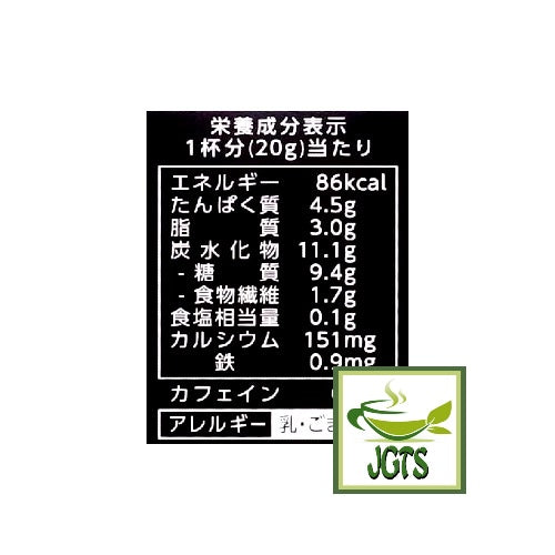 Nutrition: (Per Serving, 20g)  Energy (Calories) 86kcal, Protein: 4.5g, Lipid: 3.0g, Carbohydrates: 11.1g (Sugar: 9.4, Dietary fiber: 1.7g), Salt equivalent: 0.1g, Calcium: 151mg, Iron: 0.9mg. Caffeine: 0mg.