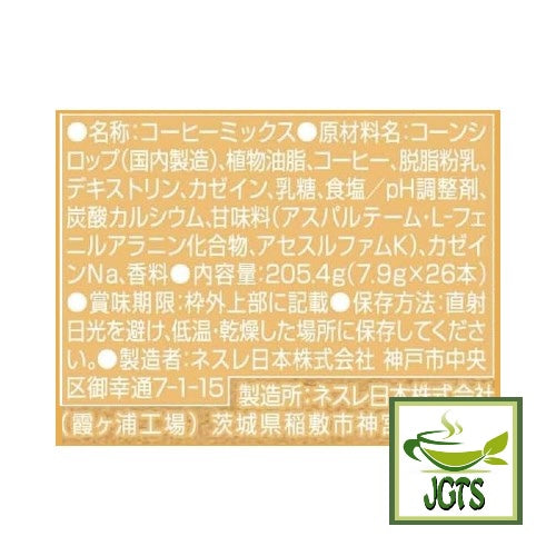 Ingredients: Corn syrup (produced in Japan), vegetable oil, coffee, skimmed milk powder, dextrin, casein, lactose, salt/pH adjuster, calcium carbonate, sweetener (aspartame L, phenylalanine compound, acesulfame K), casein Na, fragrance.