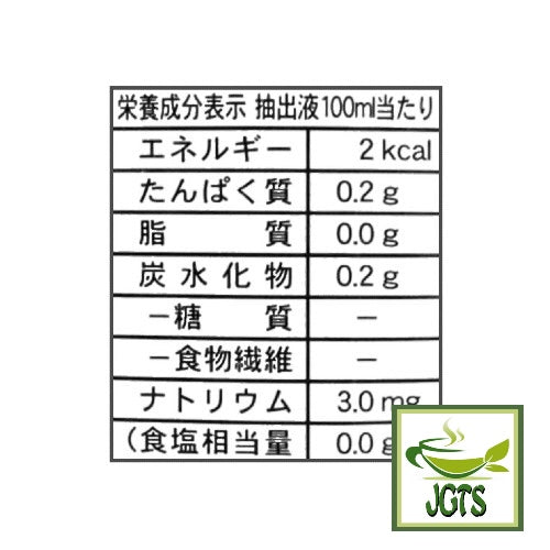 Nutrition: Per 100ml. (after extraction). Energy: 2kcal, Protein: 0.2g, Lipid: 0.2g, Carbohydrate: 0.2g, Monosaccharide: 0.2g, Dietary fiber: 0.0g, Salt equivalent: 0.0.