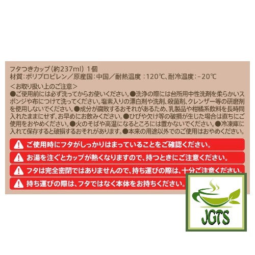 1 cup with lid (approx. 237 ml) Material: Polypropylene . Heat resistant temperature: 120 ℃, Cold resistant temperature: -20 ℃.