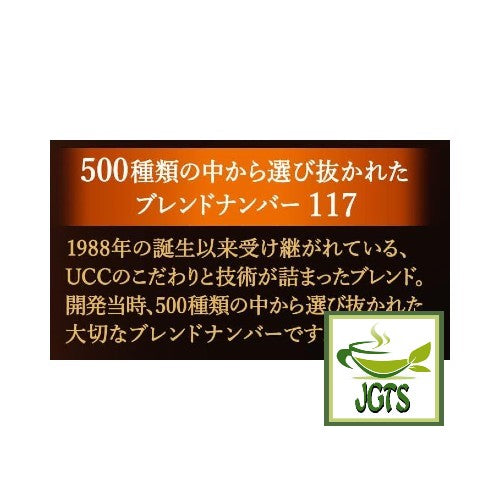 The Blend 117 Instant Coffee; Delve into the world of exquisite coffee craftsmanship with UCC's crowning achievement – The Blend 117 Instant Coffee. A labor of love, this masterpiece was meticulously crafted by UCC Master Coffee Appraisers, who embarked on a journey that spanned 500 distinct Blended Coffee samples. Through unwavering dedication, each blend was explored, savored, and evaluated, resulting in the exclusive emergence of Taste Number 117 – an embodiment of perfection that has held coffee enthusiasts captive since its inception in 1988.