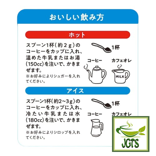 Cafe Au Lait: Put two heaping teaspoons (3 grams) in Milk (140-180ml). Add 5-6 ice cubes and stir gently until cold.