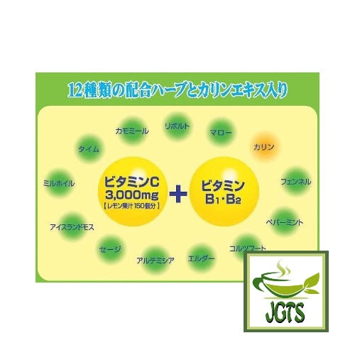 A muscat flavored throat candy that contains 3000 mg of vitamin C, 12 kinds of herbs such as peppermint, sage, and thyme, and quince extract in one bag. Further powered up with vitamin B1 and B2 combination.
