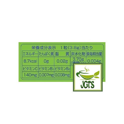 Nutrition: Per 3.8 gram piece, Energy 8.7kcal, Protein 0g, Fat 0g, Carbohydrate 3.70g (0g sugar), Salt equivalent 0.004g, Vitamin C 140mg, Vitamin B1 0.007mg, Vitamin B2 0.008mg.